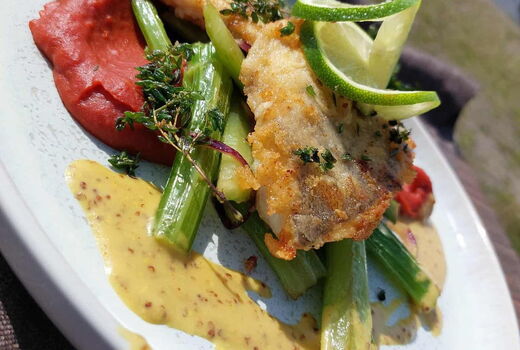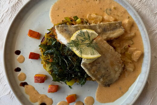 Zanderfilet mit Staudensellerie und Kürbis-Balsamico auf Kartoffel Püree mit Dijonsenfsauce.
